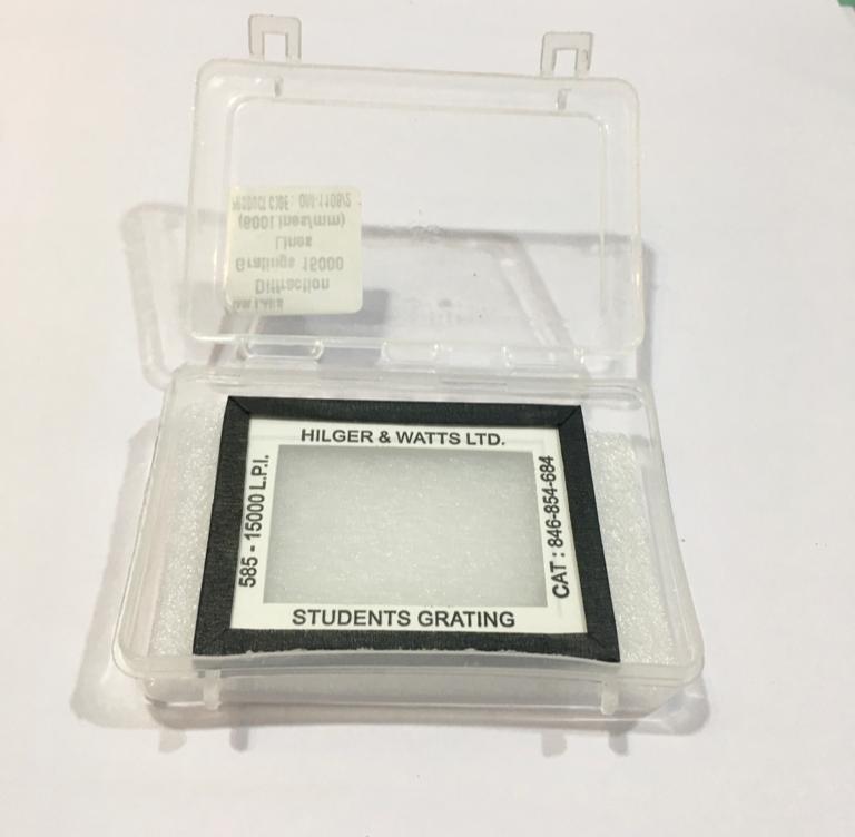 Such Diffraction Gratings are used in various scientific instruments, such as spectrometers, monochromators and other optical devices. This diffraction grating has 15000 lines per inch, So that spacing between the lines is inch divided by 15000 lines, which is approximately 1.69 x 10-4 cm.