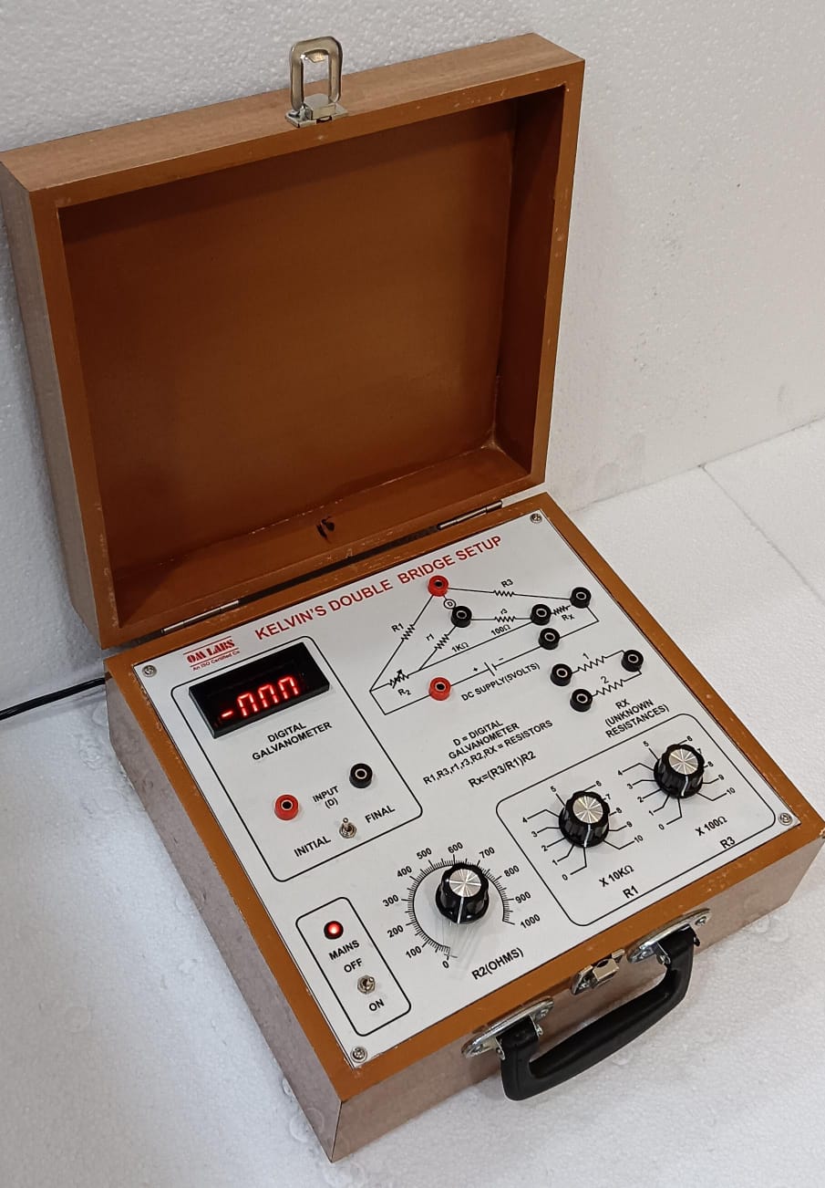 SPECIFICATION: The Kelvin Double Bridge is an electrical circuit used for measuring low resistances with high accuracy. It is an improved version of the Wheatstone Bridge and is designed to eliminate the effects of lead and contact resistance, which are significant in low-resistance measurements. The bridge consists of two arms with known resistances, one with an unknown low resistance, and a galvanometer to detect the balance point. By balancing the bridge, the unknown resistance can be calculated precisely. It is widely used in precision measurements of small resistances in laboratory settings.