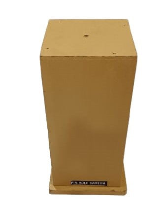 •SPECIFICATION: A pinhole camera is a simple and basic type of camera that uses a tiny hole (pinhole) to project an image onto a surface, typically film or photographic paper. When made out of wood, A very tiny hole (pinhole) is created on one side of the camera. This hole is often made using a needle or pin on a thin metal sheet (like aluminum or brass) and is carefully fixed into the camera body. The size of the hole is critical for the sharpness and exposure of the image. A wooden pinhole camera is a simple, handcrafted device used to capture images using the basic principle of pinhole photography. It is often made from lightweight, durable wood.