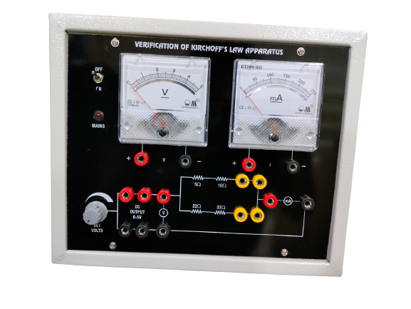 KCL & KVL Apparatus has been designed to calculate the value of current flowing through different branches of the circuit. In simple circuits, the resistance and potential difference are calculated with the helps of ohms law but in actual practice complicated circuits which contain a large number of resistances along with several sources of E.M.F. in such cases the effective resistance and the E.M.F can not be calculated easily from ohm’s law . In order to solve this networks, Kirchhoff gave two laws which are known as Kirchhoff’s Laws.